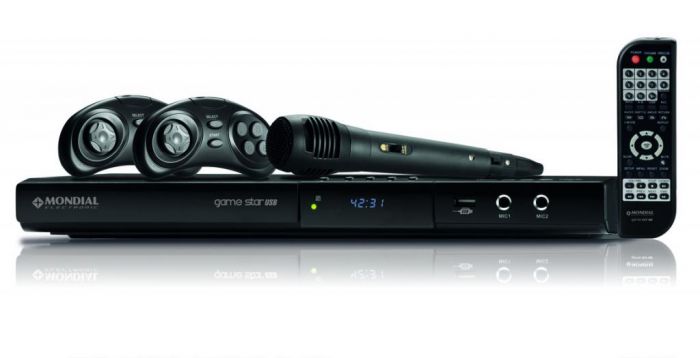 Acompanham 600 games, 1 microfone e 2 joysticks