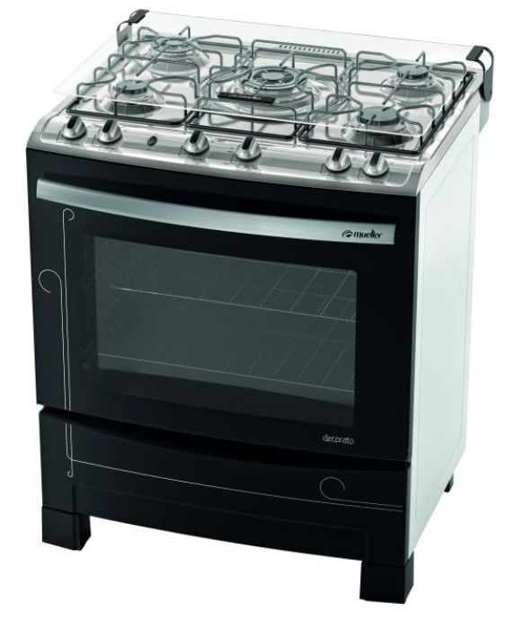 O Fogão Decorato da Mueller têm botões sobrepostos à mesa, maior capacidade do forno e dobradiça duplo estágio na porta do forno, oferecendo total ergonomia de manuseio. Oferece performance gourmet e alto rendimento com as diversas potências de queimadores. Possui um queimador central tripla chama, de 4.1kw, um queimador dupla chama, de 3kw, e queimador família de 2kw, que permite o preparo dos mais variados pratos, entregando versatilidade para o dia a dia. Tem visual clean, com vidro curvo preto em toda a porta do forno e puxador em metal escovado, oferecendo beleza, sofisticação e modernidade para a sua cozinha.